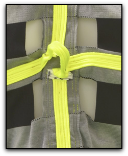The location of the tie-off point lower on the back allows for the angle of hang, reducing the risk of suspension trauma. This combination allows users to move their legs, thus reducing pressure on the femoral artery.